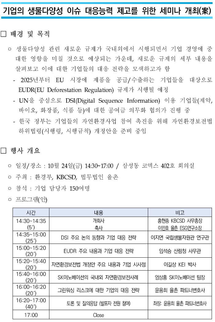 ÃÖ±Ù UN°ú ±¹Á¦»çȸ¿¡¼´Â »ý¹°ÀÚ¿ø ÀÌ¿ë ±â¾÷¿¡ ´ëÇÑ °ø¿©±Ý Àǹ«È ³íÀǰ¡ Ȱ¹ßÇÏ°Ô ÀÌ·ç¾îÁö°í ÀÖ½À´Ï´Ù. ÇÑÆí, EU¿¡¼´Â °ø½Ã Àǹ«È¿Í ´õºÒ¾î »ý¹°´Ù¾ç¼º À̽´ °ü·Ã ¼öÀÔ Á¦ÇÑ ±ÔÁ¦°¡ °ÈµÇ°í ÀÖ½À´Ï´Ù. ÀÌ¿¡ KBCSD´Â ȯ°æºÎ ¹× À²Ã̰ú °øµ¿À¸·Î ±â¾÷°ú °ü·ÃµÈ ±Û·Î¹ú ÁÖ¿ä »ý¹°´Ù¾ç¼º ±ÔÁ¦ µ¿ÇâÀ» ¤¾îº¸°í, ÀÌ¿¡ ´ëÇÑ ´ëÀÀÀü·«À» ¸ð»öÇϰíÀÚ ¾Æ·¡¿Í °°ÀÌ ¡¸±â¾÷ÀÇ »ý¹°´Ù¾ç¼º À̽´ ´ëÀÀ´É·Â Á¦°í¸¦ À§ÇÑ ¼¼¹Ì³ª¡¹¸¦ °³ÃÖÇÕ´Ï´Ù. ÀÌ¿¡ ±â¾÷ °ü°èÀںеéÀÇ ¸¹Àº °ü½É°ú Âü¿©¸¦ ºÎʵ右´Ï´Ù. °¨»çÇÕ´Ï´Ù. ------------------<°³ ¿ä>------------------- 1. ȸÀǸí : 2025³âµµ ±â¾÷ÀÇ »ý¹°´Ù¾ç¼º À̽´ ´ëÀÀ´É·Â Á¦°í¸¦ À§ÇÑ ¼¼¹Ì³ª 2. ÀϽÃ/Àå¼Ò : 10¿ù 24ÀÏ(±Ý) 14:30~17:00 / »ï¼ºµ¿ ÄÚ¿¢½º 402È£ ȸÀÇ½Ç 3. ÁÖÃÖ : KBCSD, ȯ°æºÎ, À²ÃÌ 4. Âü¿©¹æ¹ý : 10¿ù 20ÀÏ(¿ù)±îÁö Âü¿©¸µÅ© ¸¦ ÅëÇØ Âü¿©½Åû 5. ¹®ÀÇ : KBCSD »ç¹«±¹(02-6000-7664, kjw@kbcsd.or.kr)